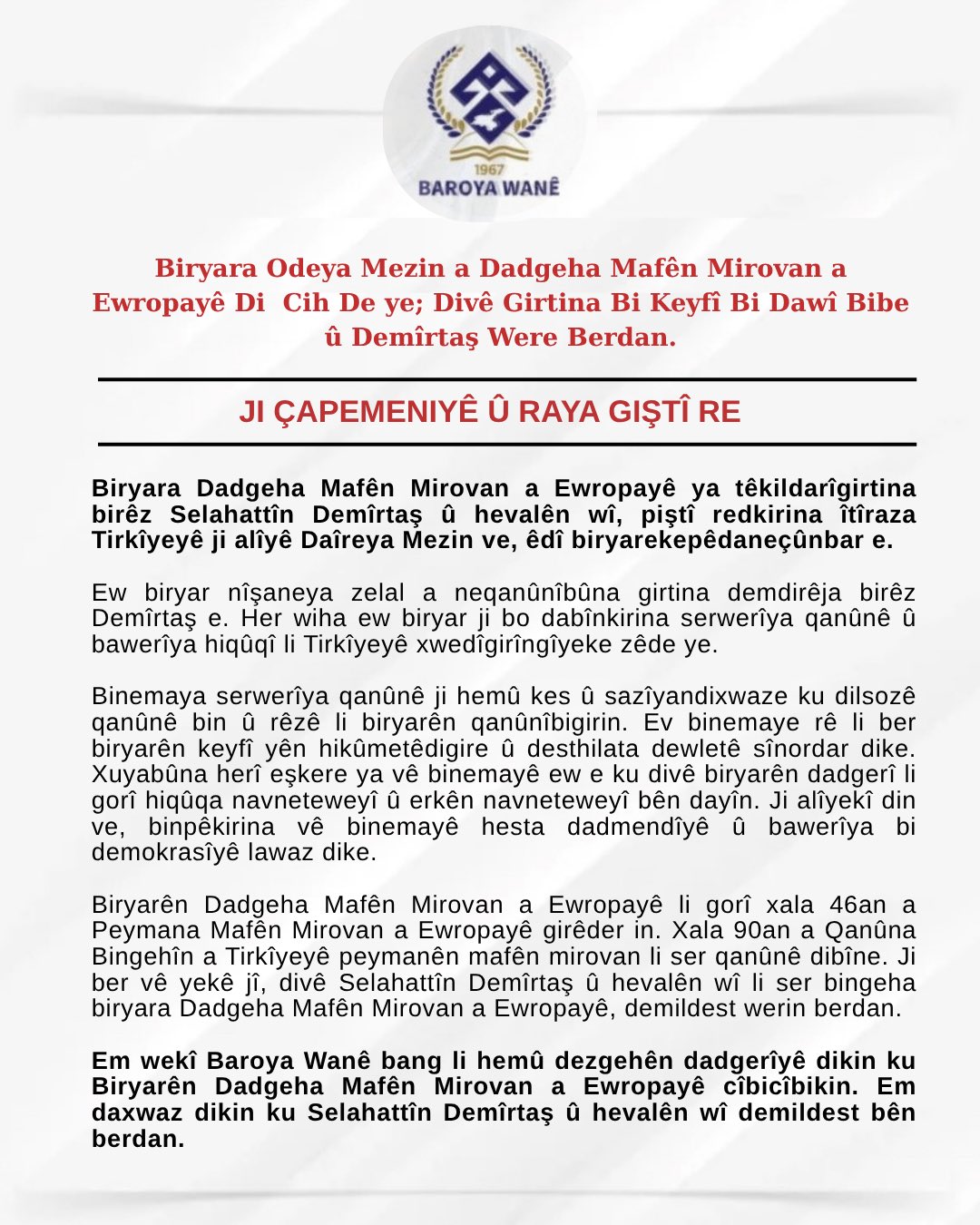 Biryara Odeya Mezin a Dadgeha Mafên Mirovan a Ewropayê Di Cih De ye; Divê Girtina Bi Keyfî Bi Dawî Bibe û Demîrtaş Were Berdan.