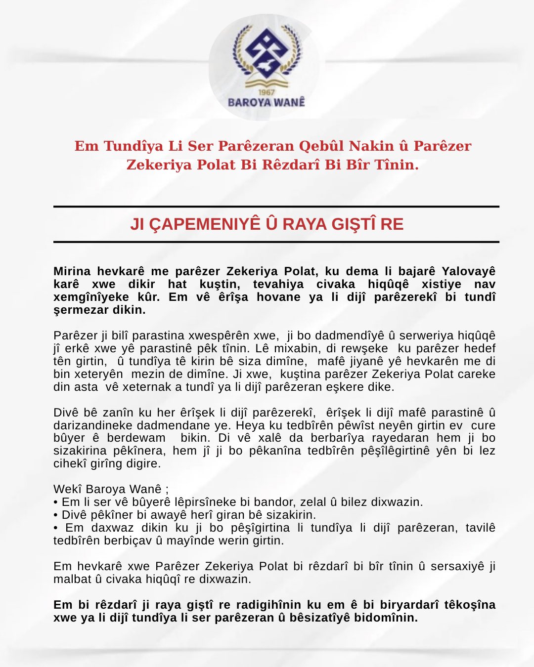 Em Tundîya Li Ser Parêzeran Qebûl Nakin û Parêzer Zekeriya Polat Bi Rêzdarî Bi Bîr Tînin.