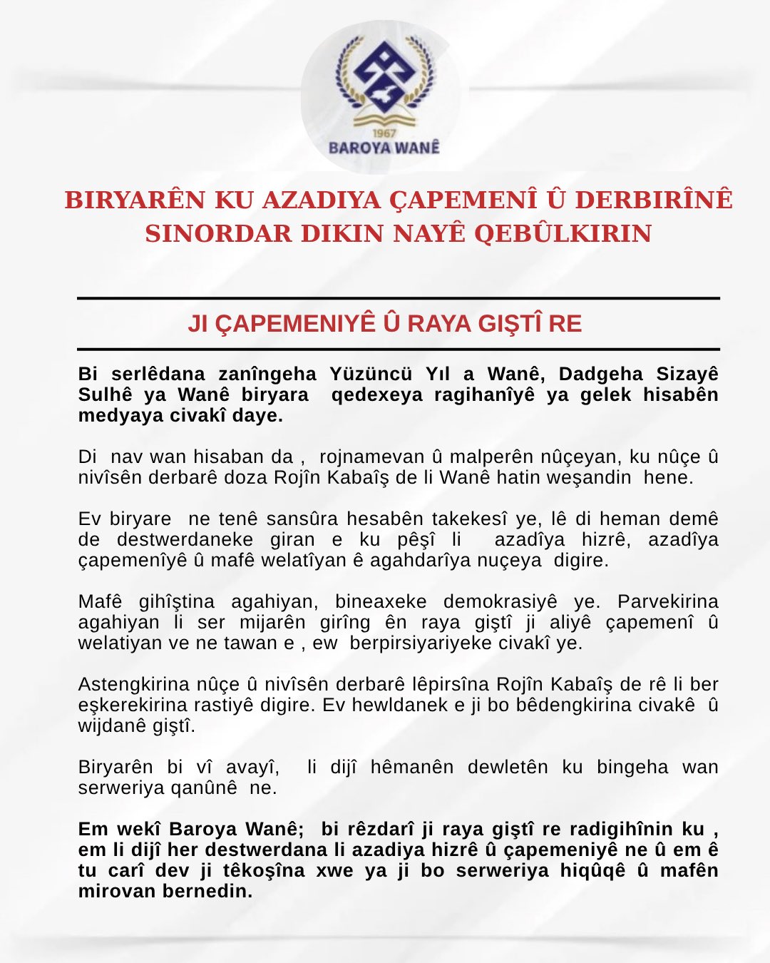 BIRYARÊN KU AZADIYA ÇAPEMENÎ Û DERBIRÎNÊ SINORDAR DIKIN NAYÊ QEBÛLKIRIN