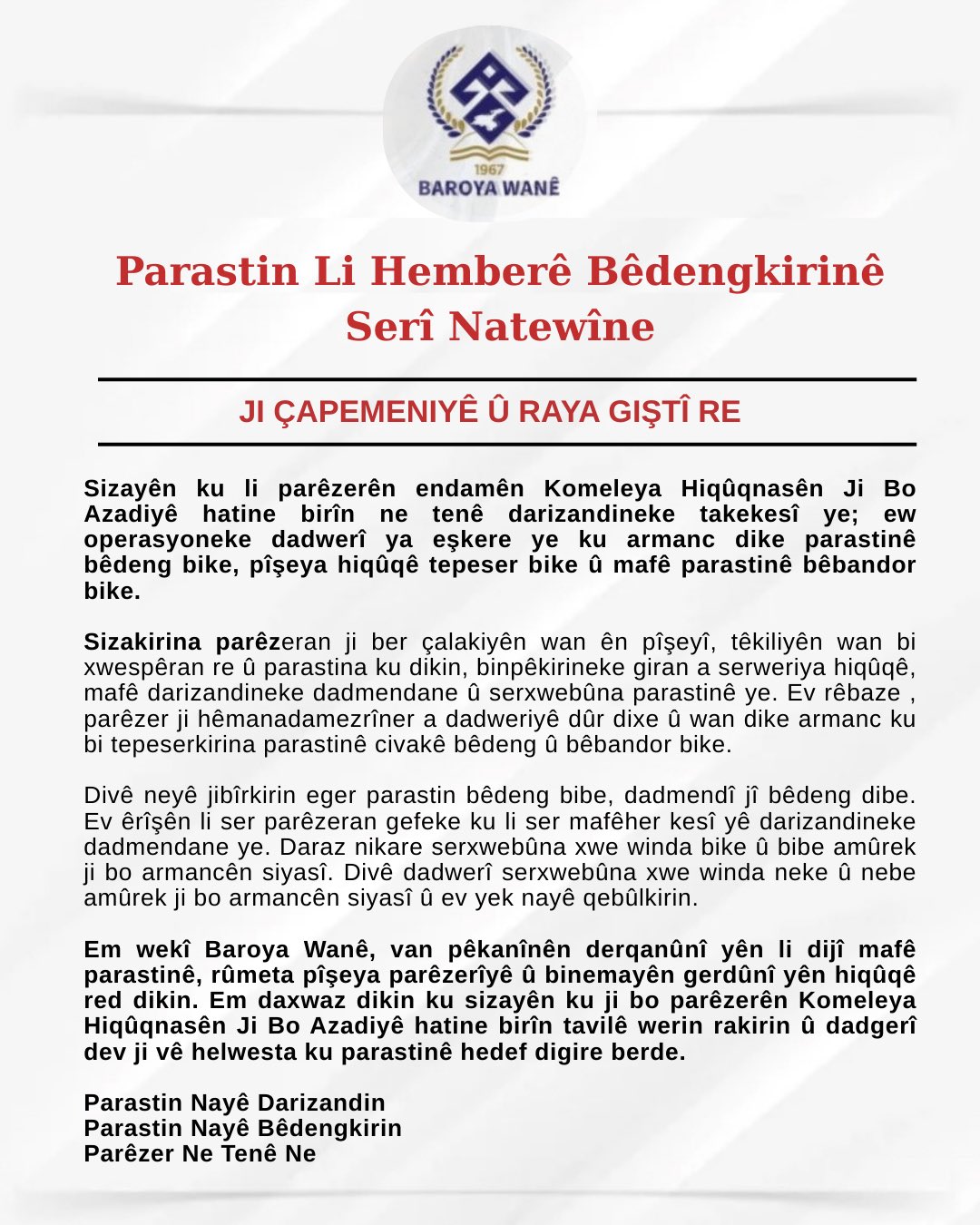 Em wekî Baroya Wanê, li gel ÎHD, ÖHD, TİHV û DADSAZ re daxuyaniya çapemeniyê ya bi sernavê “Li Rojavayê Qirkirina Neteweyî, Li Cîhanê Bêdengî” hate lidarxistin.