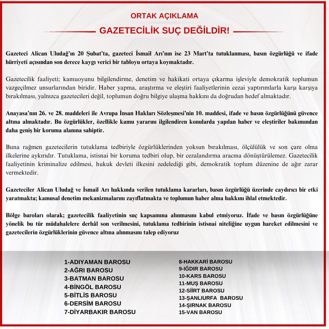 Bölge Barolarından Ortak Açıklama Gazetecilik Suç Değildir