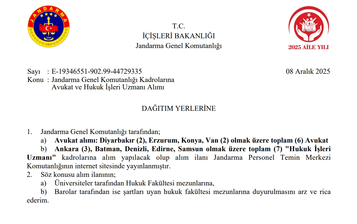 Jandarma Genel Komutanlığı Kadrolarına Avukat ve Hukuk İşleri Uzmanı Alımı